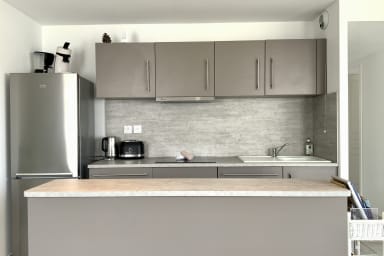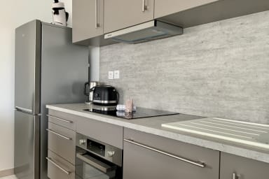La Roselière features a bright living room with a fully equipped open kitchen and central island, plus a dining area. The kitchen includes a coffee machine, toaster, kettle, microwave-oven combo, fridge, and all cooking utensils you might need.