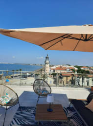 Discover Le Phare du Grau, an exceptional duplex featuring a stunning 100 sqm rooftop terrace with breathtaking panoramic views over the sea, the canal and the historic lighthouse of Le Grau du Roi.