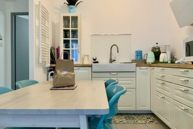 Fully equipped open kitchen (Senseo machine, oven, microwave, kettle, toaster, refrigerator, full cookware)