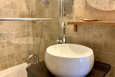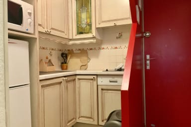 The fully renovated apartment features a bright living area with a veranda, a lounge with a sofa bed, and a fully equipped kitchen (coffee machine, kettle, toaster…).