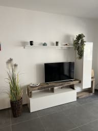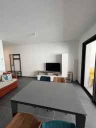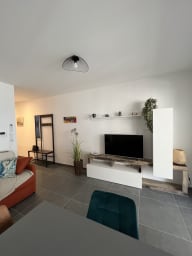La pièce de vie est spacieuse et moderne, avec un canapé convertible, une TV.